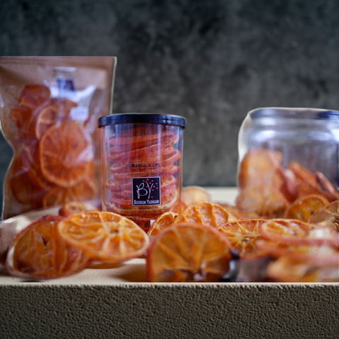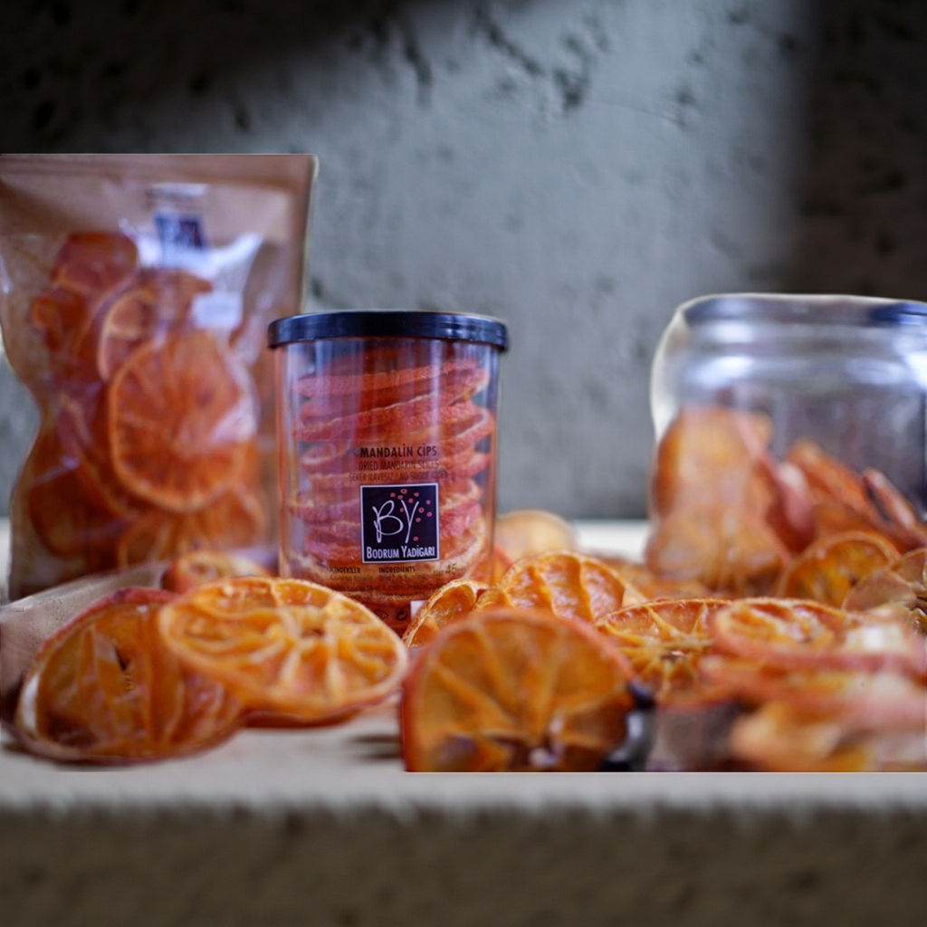 Bodrum'un ünlü mandalin bahçelerinden toplanan meyveler, özenle dilimlenip doğal yöntemlerle kurutulur. Her dilim, Akdeniz güneşinin ve deniz havasının izlerini taşır. Hiçbir şeker, hiçbir katkı maddesi eklenmez. Sadece mandalin, sadece doğal.
