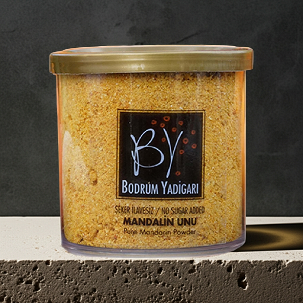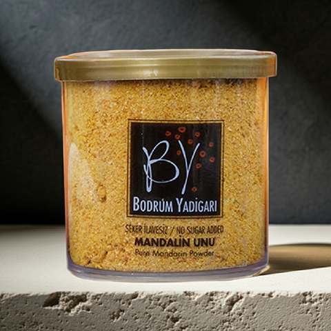 Bodrum'un meşhur mandalinleri, hasat edildiği gün dilimlenip özenle kurutulur. Sonra ince bir toz haline getirilerek size ulaşır. Ortaya çıkan bu altın sarısı un, mutfağınızda sihir yaratacak. Hiçbir katkı maddesi, hiçbir koruyucu yok. Sadece yüzde 100 Bodrum mandalini.